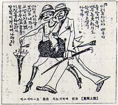 찰싹 붙어 거리를 활보하는 '모던보이 모던 걸'을 그린 '별건곤' 잡지 1927년 2월호 삽화. 1920년대는 '연애의 시대'였다. '연애의 시대'를 겨냥한 기획 상품이 노자영의 베스트셀러 '사랑의 불꽃'이었다. |