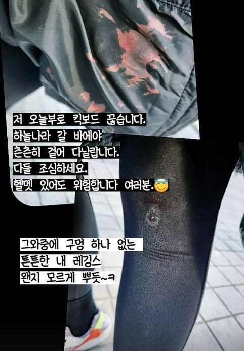 배슬기가 공개한 사진을 보면 킥보드를 타다 넘어져 만신창이가 된 모습으로 안타까움을 자아낸다.
