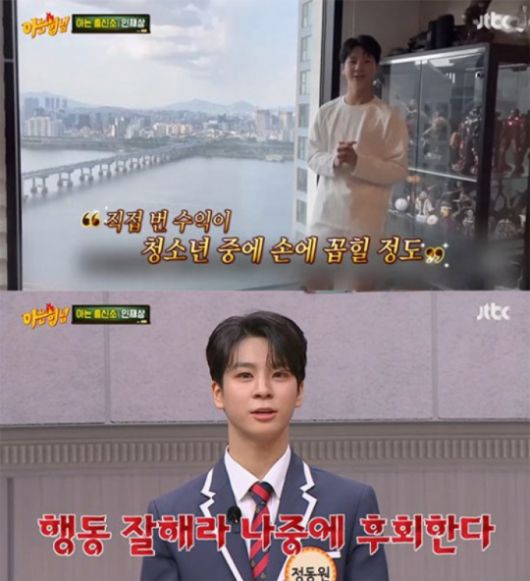 지난해 데뷔 3년 만에 한강뷰 아파트를 장만한 정동원은 '청소년 재설'이라는 소개를 받으면서 등장했다. 강호동과 서장훈은 "동원이가 청소년 재벌이다. 넓게 잡아도 톱3 안에 든다"며 "돈 관리는 누가 하냐"고 물었다.