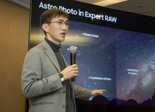 두 번째로 전문가용 하이퍼랩스 기능이다. 전문가용 사진 앱인 엑스퍼트 로우(Expert RAW) 앱에 대해 고객들의 의견을 받던 중 천체 사진 하이퍼랩스가 가능하도록 서비스를 제공해달라는 요구가 있었다. 전문가들은 보통 천체 사진을 찍을 때 적도의라는 장비를 이용해 한곳에서 계속 찍어서 합성을 통해 결과물을 얻는다. 다만 문제는 별자리가 움직인다는 점이었다. 이에 따라 합성을 할 경우 배경이 뿌옇게 흐려질 수 있다. 이에 하이퍼랩스 모드를 통해 여러 프레임을 계속 찍으면서 배경을 따로 인지하게 하고 별의 움직임도 따로 추적을 했다. 이를 각각 합성하니 배경도 별도 선명하게 나왔다는 설명이다. 그는 "국내 별자리 동호회와 함께 평창에서 하이퍼랩스로 천체 촬영을 했는데 다들 놀랐다"며 반응을 전했다.