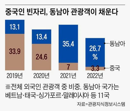 코로나 사태 이전까지 명동을 먹여 살리는 것은 ‘유커’(중국인 관광객)였다. 하지만 최근 명동의 풍경이 변하고 있다. 동남아시아 관광객들이 코로나로 사라진 유커의 빈자리를 채우고 있는 것이다. 한국을 찾는 전체 외국인 관광객 숫자는 작년 약 200만명으로, 코로나 이전인 2019년(약 1443만)에 비하면 턱없이 적다. 하지만 관광객 비율만 따지면 중국 관광객은 2019년 전체의 약 33.9%에서 작년 3.3%로 줄어들었는데, 동남아 관광객은 같은 기간 13.1%에서 26.7%까지 늘었다. 중국은 코로나 사태가 심각한 반면, 다른 나라는 일상 회복이 더 빨리 진행된 여파다.