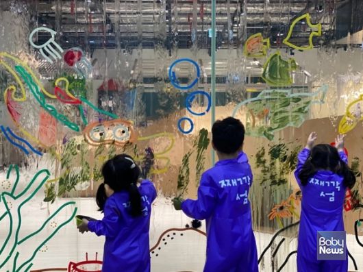 한화리조트 용인 베잔송 내 째깍섬에서 아이들이 물감 놀이인 드로잉 클래스를 체험하고 있다. 매월 클래스가 변경되며 다양한 콘텐츠 경험이 가능하다. ⓒ째깍섬 |
