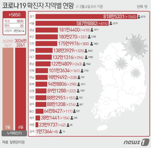 (서울=뉴스1) 양혜림 디자이너 = 6일 질병관리청 중앙방역대책본부에 따르면 이날 0시 기준 국내 코로나19 누적 확진자는 5850명 증가한 3026만3261명으로 나타났다. 신규 확진자 5850명(해외 유입 20명 포함)의 신고 지역은 서울 815명, 부산 337명, 대구 294명, 인천 300명(해외 7명), 광주 214명, 대전 151명(해외 1명), 울산 111명(해외 1명), 세종 42명, 경기 1545명(해외 1명), 강원 222명, 충북 290명, 충남 243명, 전북 161명, 전남 228명, 경북 325명(해외 2명), 경남 410명, 제주 154명, 검역 과정 8명이다.