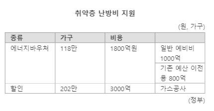산업통상자원부의 동절기 취약계층 보호 난방비 추가 지원 대책을 보면 에너지바우처를 받지 못하던 기초생활수급자와 차상위계층은 2022년 12월~2023년 3월 난방비를 총 59만2000원 지원받는다. 정부는 1월 26일 기초생활수급가구와 노인질환자 등 취약계층 117만6000가구에 올겨울 한시적으로 에너지바우처 지원금을 15만2000원에서 30만4000원으로 2배 인상했다. 한국가스공사도 사회적 배려 대상자 160만 가구에 가스요금 할인 폭을 9000원∼3만6000원에서 2배 확대하기로 했었다.