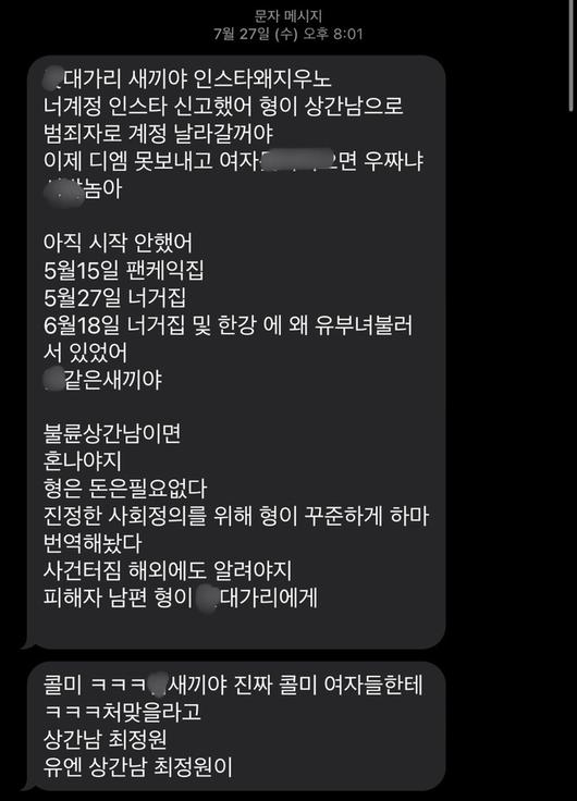 뿐만 아니라, 지난해 최정원씨는 A씨로부터 연예인이라는 점을 악용한 협박성 문자메시지를 다수 전송받기도 하였고, A씨의 인스타그램 계정에는 정치적으로 편향된, 심지어 그 내용마저 잘 이해할 수 없는 비난성 게시물이 업로드 되는 등 본 사안과 무관한 최정원씨 개인에 대한 무차별한 인신공격이 계속되고 있습니다.