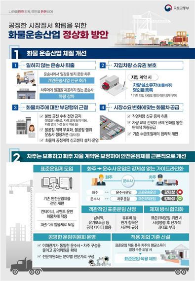 원희룡 국토부 장관은 "화물운송산업의 정상화로 국민들은 안정적인 물류서비스를 제공받고, 열심히 일한 화물차주는 공정하고 합당한 대우를 받을 수 있을 것으로 기대된다"고 말했다.