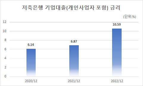 한국은행 경제통계시스템에 따르면 저축은행의 기업대출 금리는 지난해 말 10.59%로 1년전(6.87%)과 비교해 3.72%포인트(p) 올랐다. 3000만원을 5년(60개월)간 10.59%의 금리로 상환할 경우 매달 이자 26만4750원을 포함한 64만6155원을 내야한다. 지난해 말 시중은행의 기업 대출금리는 5.76%였다. 시중은행보다 두 배 높은 이자를 내야 한다.