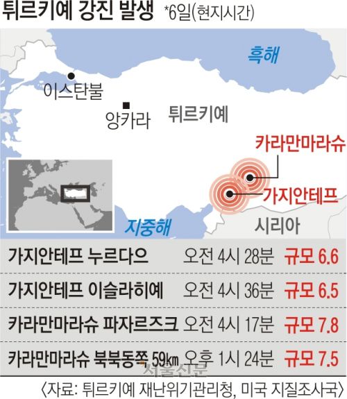 이날 오전 4시 17분 튀르키예 가지안테프 지역 파자르즈크에서 규모 7.8의 첫 지진이 발생한 뒤 규모 6 이상의 여진이 70회 이상 이어졌다. 오후 1시 24분에는 규모 7.5의 두 번째 지진이 카라만마라슈 지역을 강타했다.