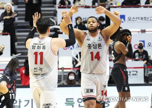 (수원=연합뉴스) 홍기원 기자 = 6일 경기도 서수원칠보체육관에서 열린 프로농구 수원 KT 소닉붐과 안양 KGC 인삼공사의 경기. 87대84로 승리한 KGC 선수들이 기뻐하고 있다. 2023.2.6 xanadu@yna.co.kr ▶제보는 카카오톡 okjebo▶연합뉴스 앱 지금 바로 다운받기~▶네이버 연합뉴스 채널 구독하기 <저작권자(c)연합뉴스. 무단전재-재배포금지.>