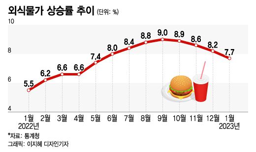 6일 통계청에 따르면 1월 외식물가 상승률은 7.7%로 지난해 6월(8.0%)부터 8개월째 외환위기 당시 수준(1998년 11월 7.4%)을 웃도는 상승세를 이어가고 있다.