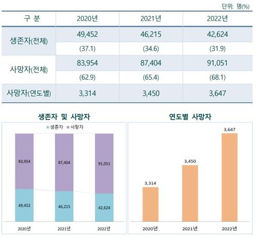 80대 이상 생존자의 비율은 2020년 64.3%, 2021년 65.3%, 2022년 65.6%로 지속해서 증가했다.