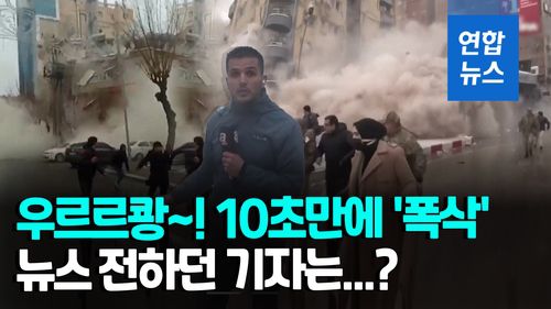 (서울=연합뉴스) 생중계하는 방송 기자 뒤로 7층 높이의 건물이 종잇장처럼 힘없이 구겨지며 주저앉았습니다.