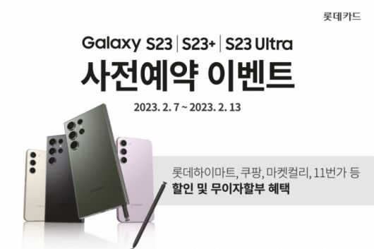 롯데카드는 오는 13일까지 갤럭시 S23 시리즈를 롯데 개인 신용카드로 사전예약하는 고객에게 결제 금액의 최대 12%를 할인해준다고 7일 밝혔다.