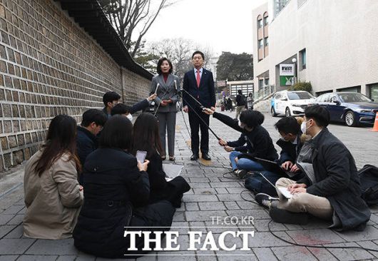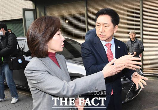 [더팩트ㅣ이동률 기자] 국민의힘 김기현 당 대표 후보와 나경원 전 원내대표가 7일 오후 서울 중구 달개비 앞에서 전당대회 관련 입장을 발표하고 있다.