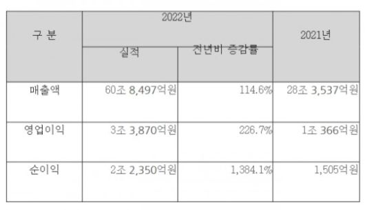 정유부문인 현대오일뱅크는 지난해 매출 34조9550억 원과 영업이익 2조7898억 원을 기록했다. 유가 상승 및 정제마진 개선으로 매출이 전년 대비 68.0% 상승해 HD현대의 호실적을 주도했다.
