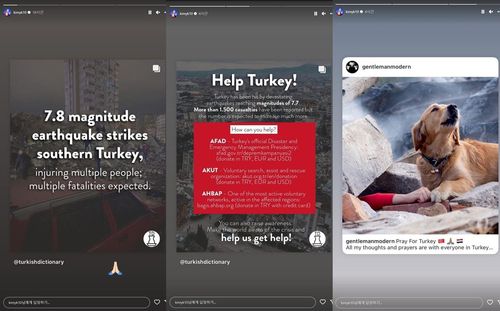 첫 번째는 게시물은 지진이 일어난 지 얼마 지나지 않은 시간이었고, 두 번째와 세 번째 게시물은 어마어마한 규모의 피해가 알려지고 난 뒤다.