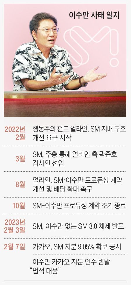 국내 대형 음반 기획사 SM의 최대 주주인 이수만(71) 전(前) 총괄프로듀서가 앨범 기획 관련 전권을 내려 놓고 경영 일선에서 물러나는 이른바 ‘SM 3.0′ 계획을 3일 공식 발표<본지 6일 자 A16면>한 이후 의외의 상황이 발생했다. ‘K팝 대부’의 아름다운 퇴진으로 알려졌지만, 그가 7일 법적 소송을 예고한 것이다.