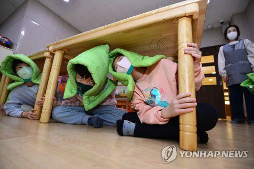 (포항=연합뉴스) 손대성 기자 = 8일 경북 포항시 남구 대이동에 있는 포항시청 어린이집 원생들이 지진 대비 훈련을 하고 있다. 2023.2.8 sds123@yna.co.kr ▶제보는 카카오톡 okjebo▶연합뉴스 앱 지금 바로 다운받기~▶네이버 연합뉴스 채널 구독하기 <저작권자(c)연합뉴스. 무단전재-재배포금지.>