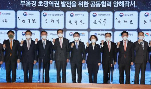 지난해 4월 19일 오전 정부서울청사에서 열린 '부울경 특별자치제 지원을 위한 협약식'에서 참석자들이 협약서에 서명한 뒤 기념 촬영하고 있다. 연합뉴스 |
