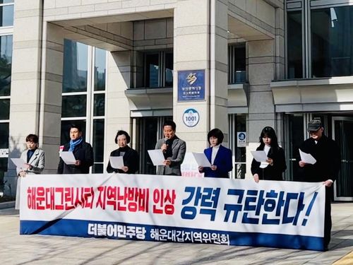 (부산=연합뉴스) 손형주 기자 = 더불어민주당 부산 해운대갑지역위원회는 8일 부산시청 앞에서 기자회견을 열어 부산시의 해운대그린시티 지역난방비 인상을 규탄했다.