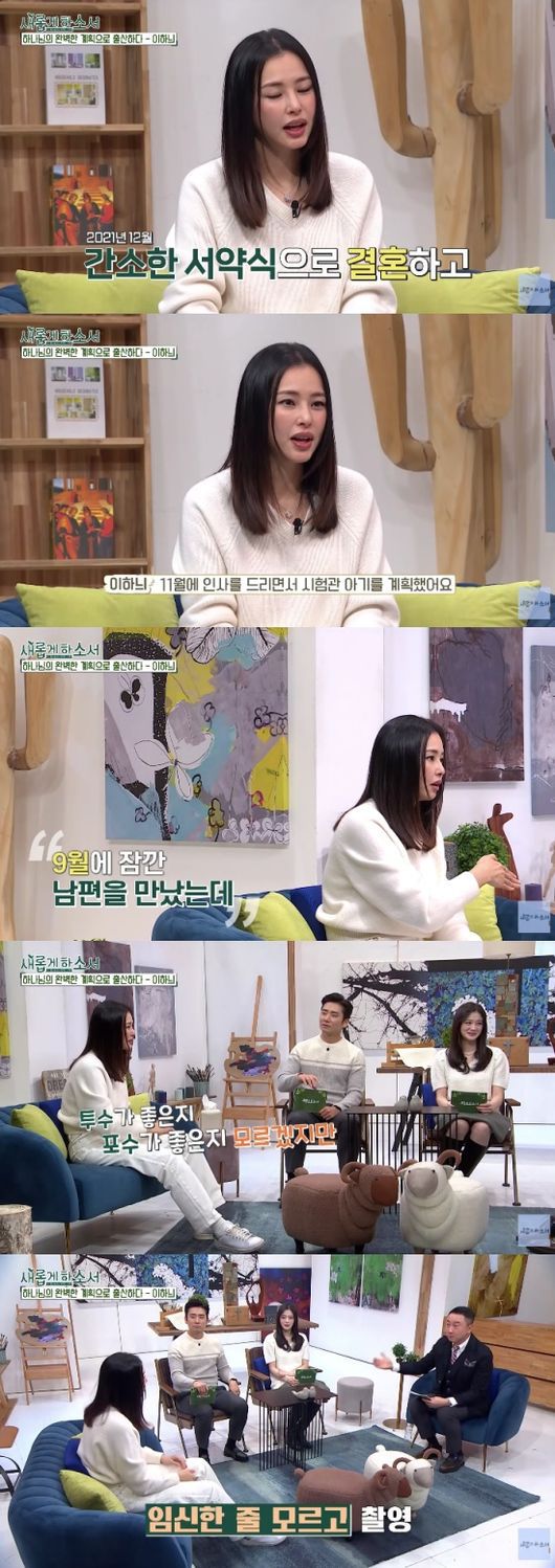 이하늬는 임신 기간을 회상하기도 했다. 성경 필사로 태교를 했다는 그는 “임신은 여자의 희생이라 생각해서 회의적으로 생각했다. 낳고 나서의 아빠의 역할을 몰랐던 것이다. 남편이 든든했기 때문에 임신 기간을 축제로 보낼 수 있었다”라고 말했다. 그러면서 “‘이건 한 번 해봐야 돼’라며 주위에 추천한다”라고 덧붙이기도 했다.