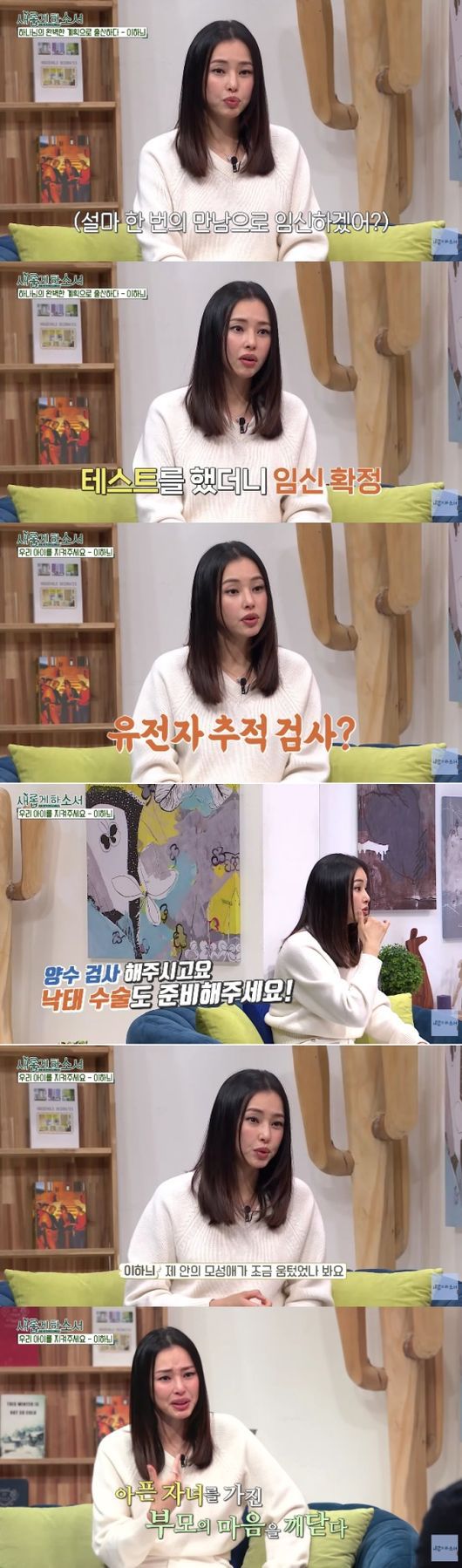 그러나 이하늬에게도 고난은 있었다. 그는 “원래 (아이가) 건강했다가 대학병원에서 유전자 추적 검사를 했으면 좋겠다고 연락이 왔다. 노산이라 검사를 더 많이 했다. 유전자 검사를 했는데 제가 양성일 가능성이 높다며 ‘양수검사를 하고 낙태수술도 해야 할 수 있다’고 말하더라”라며 청천벽력 같았던 상황을 떠올렸다.