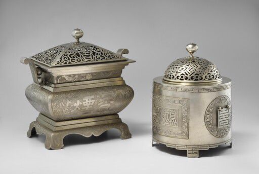 사각과 원형의 백동향로 2점은 하늘과 땅을 상징하는 ‘천원지방’(天圓地方)을 의미한다. 황제의 치세를 표상하는 대관식의 취지를 잘 드러내고 있다는 평가를 받았다. 직선과 유려한 곡선을 조화롭게 융합하고 정교하게 투조했다. 사각 향로 몸체에는 ‘향연’(香煙·향기로운 연기가 서리다), 둥근 향로에는 ‘진수영보’(眞壽永寶·참다움과 장수, 영원한 보물)라는 글자를 새겨 축하 의미를 담았다.
