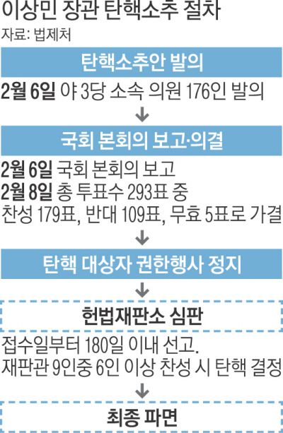 같은 시각 민주당은 이 장관 탄핵소추안 표결을 위한 준비에 돌입했다. 이재명 대표는 국회 최고위원회의에서 “이번 탄핵안은 윤석열 정권의 비상식과 무책임을 바로잡는 첫걸음이 될 것”이라고 말했다.