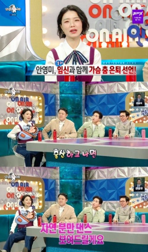 안영미는 “올해 임신과 함께 가슴춤은 은퇴했다. 출산하고 나면 자연분만 댄스 보여드리도록 하겠다”라고 선언했다. 이어 자연분만 댄스 제스처를 취해 기대감을 자아냈다.