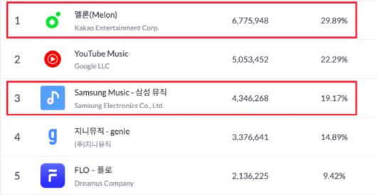 멜론은 모바일인덱스 Insight의 지난 1월 리포트에서 안드로이드 및 iOS 합산 677만명의 MAU로 작년에 이어 올해도 국내 음악 카테고리 내 굳건히 1위를 지켰다. 이어 2위 유튜브뮤직(505만명명), 3위 삼성뮤직(434만명), 4위 지니뮤직(337만명), 5위 FLO-플로(213만명)순이었다. MAU를 통한 음악 카테고리 내 멜론의 시장점유율은 29.8%로 멜론이 삼성전자로부터 위탁운영 중인 삼성뮤직의 19.1%까지 합칠 경우 절반에 육박하는 48.9%에 달했다.