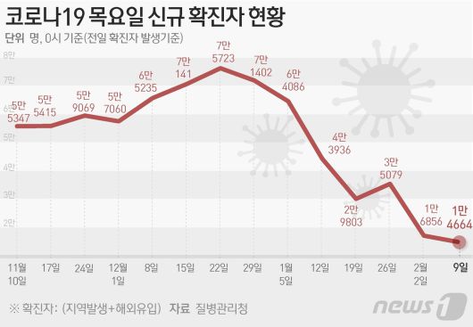 (서울=뉴스1) 김초희 디자이너 = 질병관리청 중앙방역대책본부(방대본)는 9일 0시 기준 신종 코로나바이러스 감염증(코로나19) 신규 확진자가 1만4664명 발생했다고 밝혔다a_a@news1.krCopyright ⓒ 뉴스1. All rights reserved. 무단 전재 및 재배포 금지.
