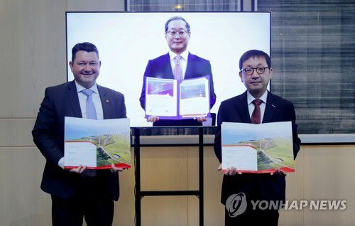 (서울=연합뉴스) 두산퓨얼셀이 9일 서울 종로구 포시즌스호텔에서 남호주 주 정부, 두산 자회사 하이엑시엄(Hyaxiom)과 수소 산업 육성을 위한 업무협약을 체결했다고 밝혔다. 사진은 협약 체결 후 기념 촬영하는 샘 크래프터 남호주 수소발전청 최고경영자(왼쪽부터), 정형락 두산퓨얼셀 사장, 제후석 부사장. 2023.2.9 [두산 제공. 재판매 및 DB 금지]