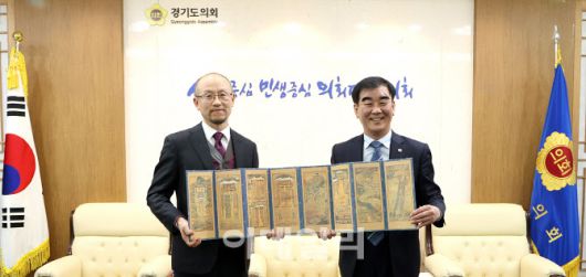 지난 8일 경기도의회 의장 접견실에서 염종현 경기도의장(오른쪽)이 강바트 전 몽골 다르항올도의원에게 ‘능행도 8첩 병풍’을 전달하고 있다.(사진=경기도의회) |