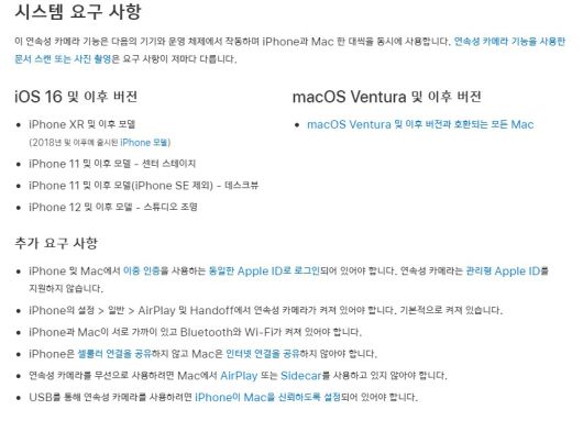 연속성 카메라는 모든 맥과 모든 아이폰에서 사용할 수 있는 건 아니고 특정 조건을 만족해야만 작동한다. 아이폰 XR 또는 그 이후에 출시된 아이폰이 필요하며, 맥 컴퓨터에는 macOS Ventura가 설치되어 있어야 한다.