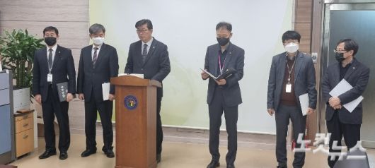 이광우 충북교육청 교육국장(왼쪽 세번째)이 다음달 1일자 교원 인사 내용을 브리핑하고 있다. 김종현 기자 |