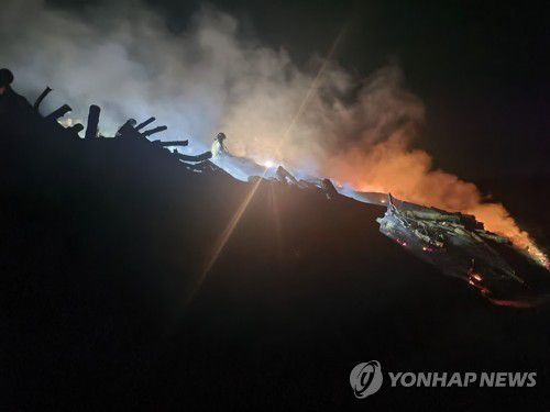 (서울=연합뉴스) 신현우 기자 = 9일 오후 7시 15분께 충청남도 논산시 가야곡면에 발생한 산불을 산림당국이 진화하고 있는 모습.