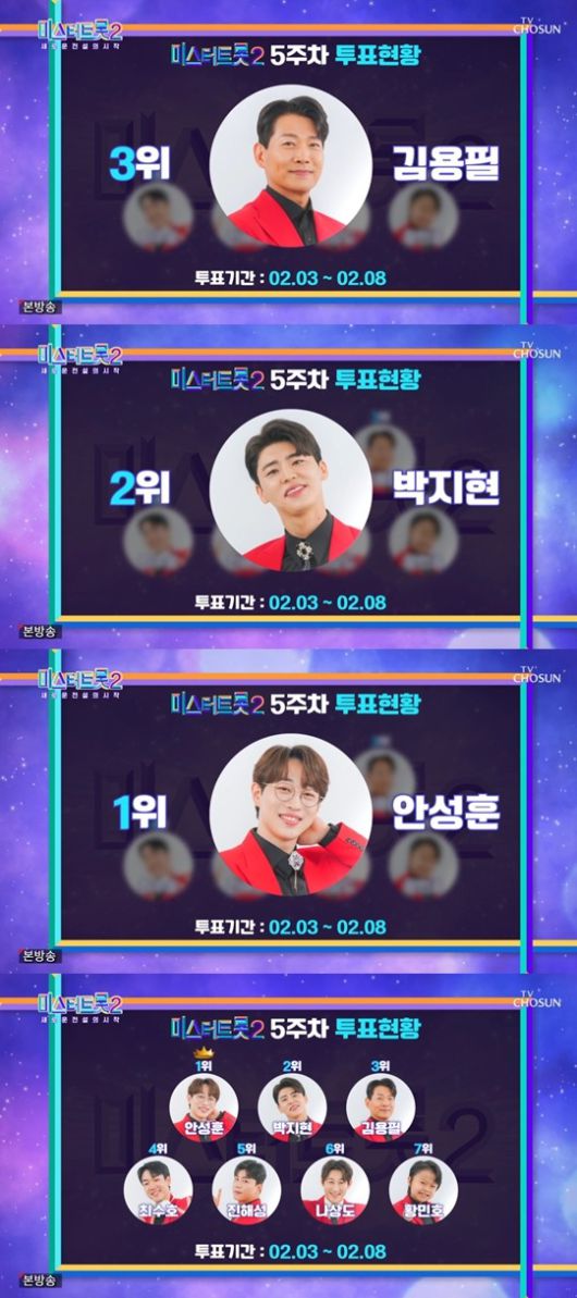 [헤럴드POP=정은진기자]9일 방송된 TV CHOSUN '미스터트롯2-새로운 전설의 시작(이하 미스터트롯2)' 8회에서는 본선 3차전 메들리 팀 미션의 막이 올랐다. 본격적인 대결 전, 5주차 온라인투표 순위가 공개됐다.