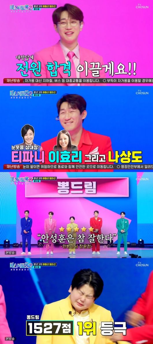 이날 안성훈은 메들리 팀전을 위해 한태이, 임찬, 나상도, 박성온과 함께 '뽕드림' 팀을 결성하였다. '뽕드림' 팀은 김연자의 '밤열차'로 무대를 시작해, '연하의 남자', '얼쑤', '황포돛대', '모나리자'를 부르다 '인생 뭐 있나' 로 마무리를 지었다. 이들의 노래를 모두 들은 이홍기는 "결승전 무대 아니야?" 라고 외치며 놀람을 표했다. 다른 마스터들 또한 "못 하는 사람이 한 명도 없었다" 며 감탄했다.
