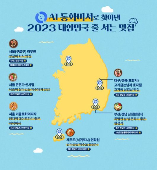 이번 맛집 지도는 KT 'AI통화비서'가 얼마나 많은 예약을 받았는지를 분석한 것이다. 이른바 '전화통에 불이 난 맛집'인 셈이다.