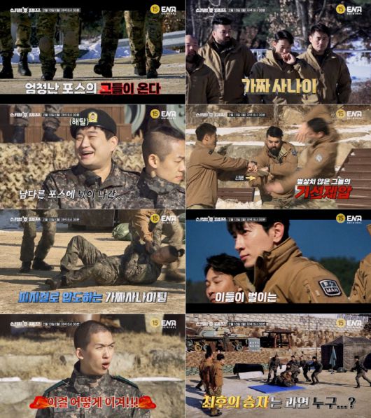그런가 하면 ‘가짜사나이’ 팀의 등장에 전투력을 상실한 ‘신병즈’의 모습이 웃음을 자아낸다. 김민호와 전승훈은 눈 앞에 펼쳐진 현실을 부정하고 싶은 듯 착잡한 표정. 급기야 남태우는 마치 넋이 나간 듯 너털웃음을 터뜨리는 모습으로 보는 이의 웃음보를 자극한다. 급기야 ‘가짜사나이’ 줄리엔강은 ‘신병즈’ 앞에서 보란 듯이 팔꿈치로 야구 배트를 두 동강 내며 넘치는 파워를 자랑하고, 이정현·남태우가 ‘가짜사나이’ 팀에게 줄줄이 내동댕이쳐지는 모습이 이어져 ‘신병즈’의 험난한 첫 대결을 예고한다.