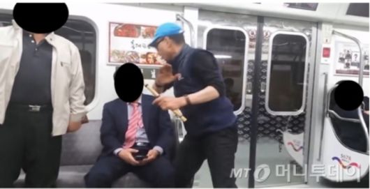 술에 취한 70대 노인이 지하철 안에서 한 손에 단소를 들고 시민들을 위협하고 있다. 2015년 포착돼 '7호선 단소 살인마'라는 별명으로 불린 '지하철 빌런'. /사진제공=서울시 |
