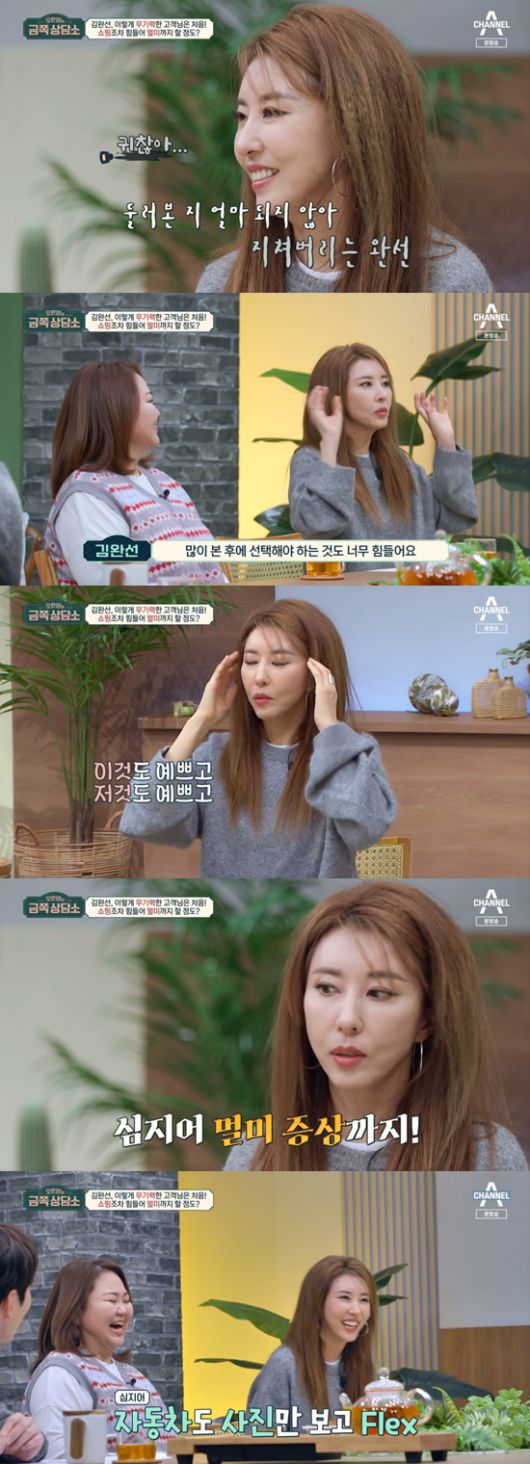 또한 "연애 생각만 해도 힘들다"고 고백했다. 쇼핑도 마찬가지였다. 김완선은 "많이 보는 것도 힘들고 그중에서 선택하는 것도 힘들다. 조금만 봐도 어지럽다. 멀미 증상이 있을 정도"라고 말해 모두를 놀라게 했다.