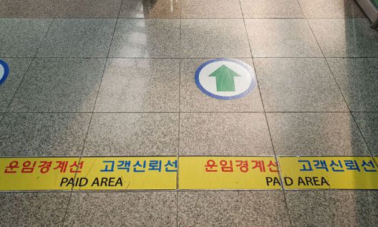 지난 7일 오후 2시쯤 경부·강릉선 열차 이용객으로 붐비던 서울역 맞이방에서 승강장으로 이어지는 길목 바닥에 이같이 적힌 노란선이 눈에 띄었다. 어림잡아 길이 10m로 보이는 이 경계선은 오래된 듯 곳곳이 해져 있었다.