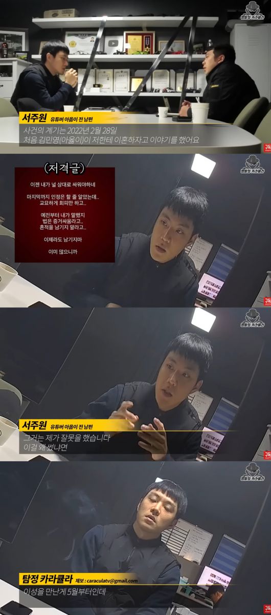 10일 유튜브 채널 ‘명탐정 카라큘라’에서는 서주원이 출연해 “이혼 도장 찍기 전에 여자를 만난 것은 제 잘못”이라면서도 “이혼 사유는 성격 차이”라고 선을 그었다.