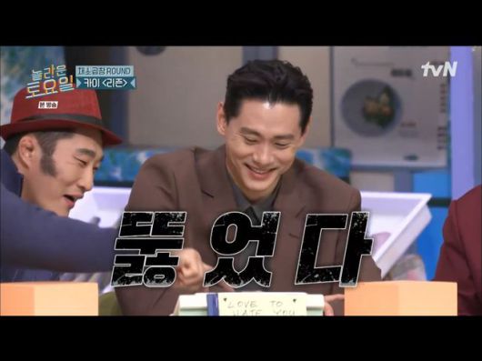 신동엽은 “처음이라면서 목소리에 여유가 철철 넘친다”라며 유태오의 재치를 칭찬했다. 유태오는 “제가 정말 긴장했다. 제가 국어 들어가는 게임을 하면 항상 진다. 들어오기 전에 시나리오를 봤다”라면서 부드러운 음성으로 여유 넘치는 대사를 쳤다.