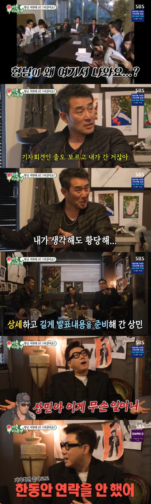 특히 최진혁은 "이런 사연이 있어서 기자회견도 가셨던 거구나"라며 이상민의 이혼 기자회견을 언급했다. 최민수는 "내가 모르고 가다가 만난 거다. 기자들이 길을 열어주는 거다"라며 귀띔했고, 이상민은 "웃긴 상황이긴 하다. 당사자인 내가 가기 전에 먼저 도착했다. 내가 2시 30분에 도착하기로 했다 치면 형님은 1시 50분쯤 지나가다가 '무슨 일이 있는 건데?' 하면서 날 기다리고 있었다. 그 상황에서도 나한테 전화를 안 한 거다. 난 형님이 계신 줄도 모르고"라며 털어놨다.
