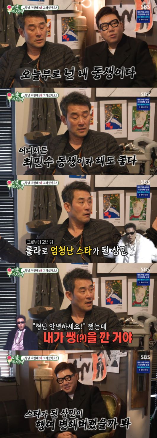 최민수는 "룰라가 돼서 엄청 스타가 됐다. 2년 정도 지난 다음에 MBC 로비에서 만났다. 상민이가 나한테 '형님 안녕하세요' 했는데 내가 쌩을 깠다. '누구야?' 이러고 지나갔다. 내가 겁이 났던 거다. 저렇게 잘 된 상민이가 혹시나 망가졌을까 봐"라며 고백했다.