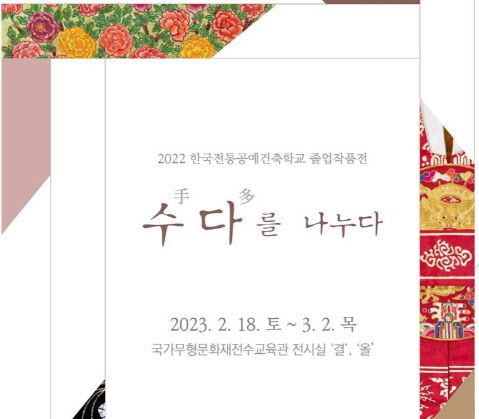 [이데일리 이윤정 기자] 한국문화재재단은 2022년 한국전통공예건축학교 수강생들의 졸업작품전 ‘수다(手多)를 나누다’를 오는 18일부터 3월 2일까지 서울 강남구 국가무형문화재전수교육관 전시장에서 개최한다.