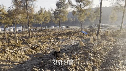 1m 간격으로 다닥다닥 붙은 나무판 묘비에는 잔해 아래서 추위에 떨었을 희생자의 마지막 가는 길을 배웅하듯 목도리가 둘러져 있거나 비닐이 덮여져 있었다. 어린 조카 둘을 잃은 한 남성은 “신이 우리를 세상에 데리고 왔듯이 다시 거둬간 것 같다”고 말했다. 그는 제대로 된 묘를 만들어 주지 못하는 현 상황을 두고 “이것저것 잴 겨를이 없는 상황”이라며 “지금은 무엇보다 (숨진 이들을) 얼른 눕혀 줘야 한다”고 말했다.