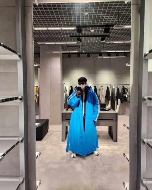 임영웅은 파란색 오버핏 점퍼를 입고 거울 앞에서 셀카를 찍고 있다. 그는 마스크, 선글라스로 얼굴을 꽁꽁 가린 상태. 특히 남다른 임영웅의 옷 핏이 돋보인다.